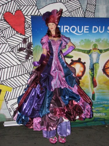 Next, just outside of Anno Domini, I came across this lovely performer from Cirque du Soleil. She was a hoot! So charming and funny, and made sure that I had her shoes in the shot. She had to be standing at 8 feet tall or so thanks to small stilts that she was balancing on. What was very interesting was that when I asked if I could take her picture, she held her pose so well, and after she said she was always in a constant state of motion because the stilts weren’t wide enough to relax on. The jewel colors of the dress are lovely and in her right hand is a small cluster of feathers (peacock maybe?) but from the picture it looks to me like she was holding the sting to the balloon that was painted onto the wall.