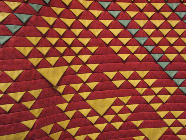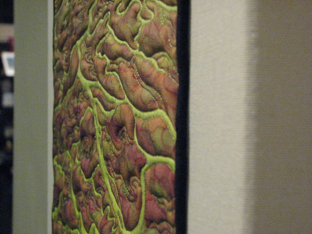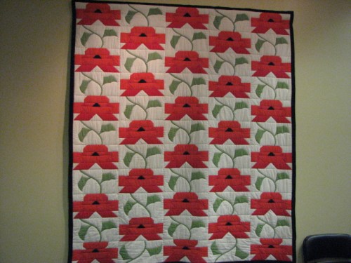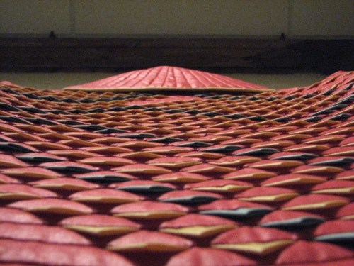 Once I headed out of Eulipia, I walked to the MACLA building. Little did I know, but there was a performance piece inside. The performance time had just passed, but there was going to be another in 45 minutes, so I decided to hustle over to the San Jose Museum of Quilts and Textiles. One of the first things I encountered while there was a large quilt hanging outside the bathrooms that to me looked like something other than a poppy. And I work in a nursery so I am used to seeing them. I mean abstractly, I supposed I can see it being a poppy, but not without a little help. When I look at it, I see the AIDS ribbon, but I guess we are all influenced by our lives and experiences.